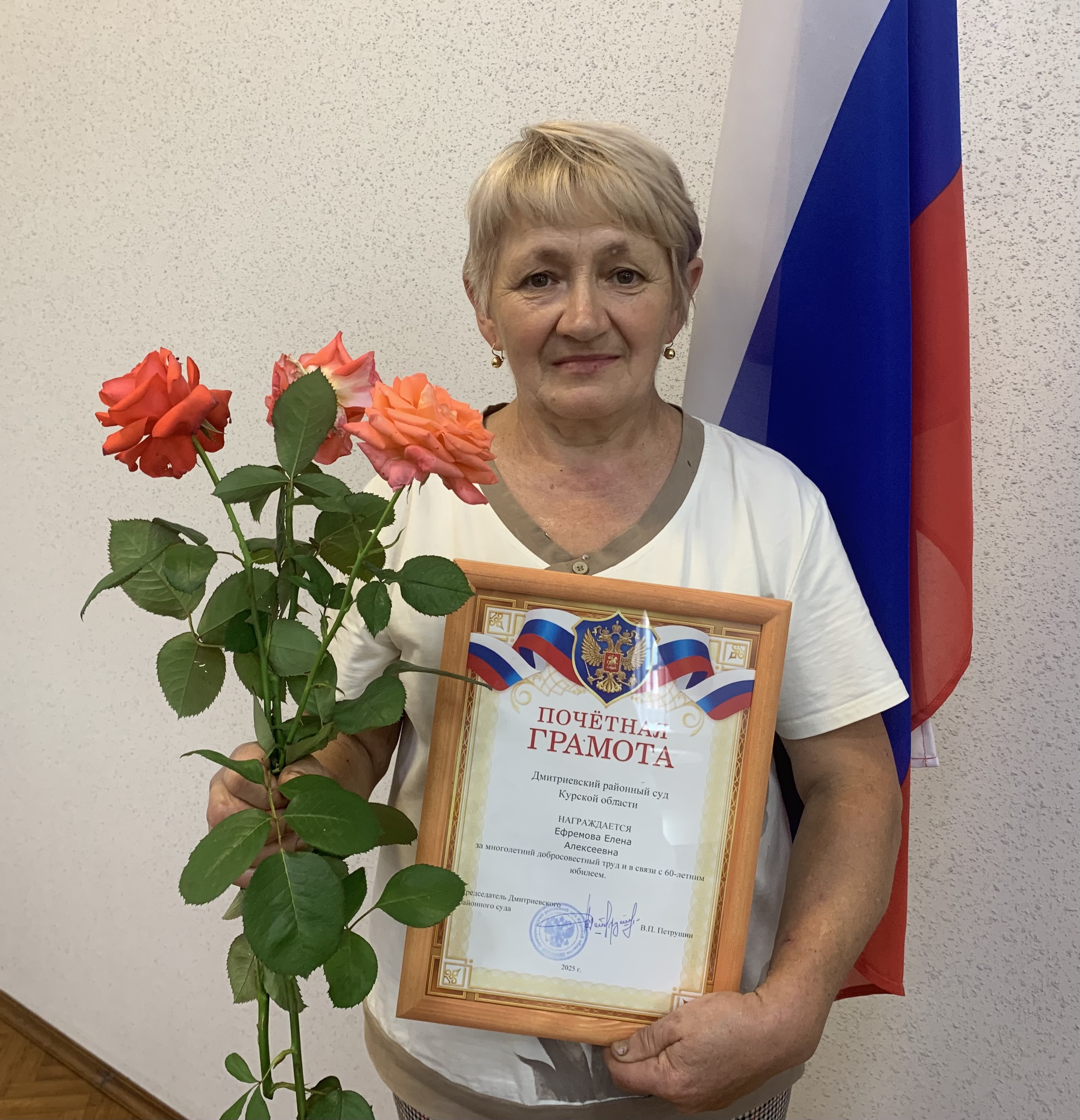 8 августа свой юбилей отмечает уборщик производственных и служебных помещений Дмитриевского районного суда Елена Ефремова. Родилась Елена Алексеевна в поселке Ново-Дворский Касторенского района. После школы и училища трудилась в типографии наборщиком текста и вот уже 13 лет, как она поддерживает чистоту и порядок в здании Дмитриевского районного суда. Но не только любовь к порядку и чистоте отличает Елену Алексеевну. Большим количеством цветов суд также обязан Ефремовой Е.А. Как большой любитель комнатных и уличных растений она выращивает цветы не только дома, но и на работе, в том числе на клумбе во дворе суда. За многолетний добросовестный труд и в связи с 60-летним юбилеем Елена Алексеевна награждена Почетной грамотой Дмитриевского районного суда. Судьи, мировой судья, коллективы суда и судебного участка мирового судьи Дмитриевского района сердечно поздравили юбиляршу с праздничным событием, и.о. председателя суда Ольга Мацько вручила грамоту, подарок и цветы. Собравшиеся пожелали Елене Алексеевне крепкого здоровья, терпения в этом нелегком достойном уважении труде, семейного благополучия и желанного достатка. Объединенная пресс-служба судебной системы Курской области Для СМИ: дополнительную информацию можно получить по телефону +7 (47150) 2-34-50, 2-22-97, сотрудник Объединенной пресс-службы судебный системы Курской области Брилева Анна Владимировна. При полном или частичном использовании материала ссылка на Объединенную пресс-службу судебной системы Курской области или официальный сайт Дмитриевского районного суда Курской области обязательна. Актуальные новости о судебной системе Курской области читайте в нашем канале в Telegram https://t.me/sudrfkursk и на официальной странице в социальной сети «ВКонтакте» https://vk.com/sudrfkursk (Объединенная пресс-служба судебной системы Курской области). ![]() |